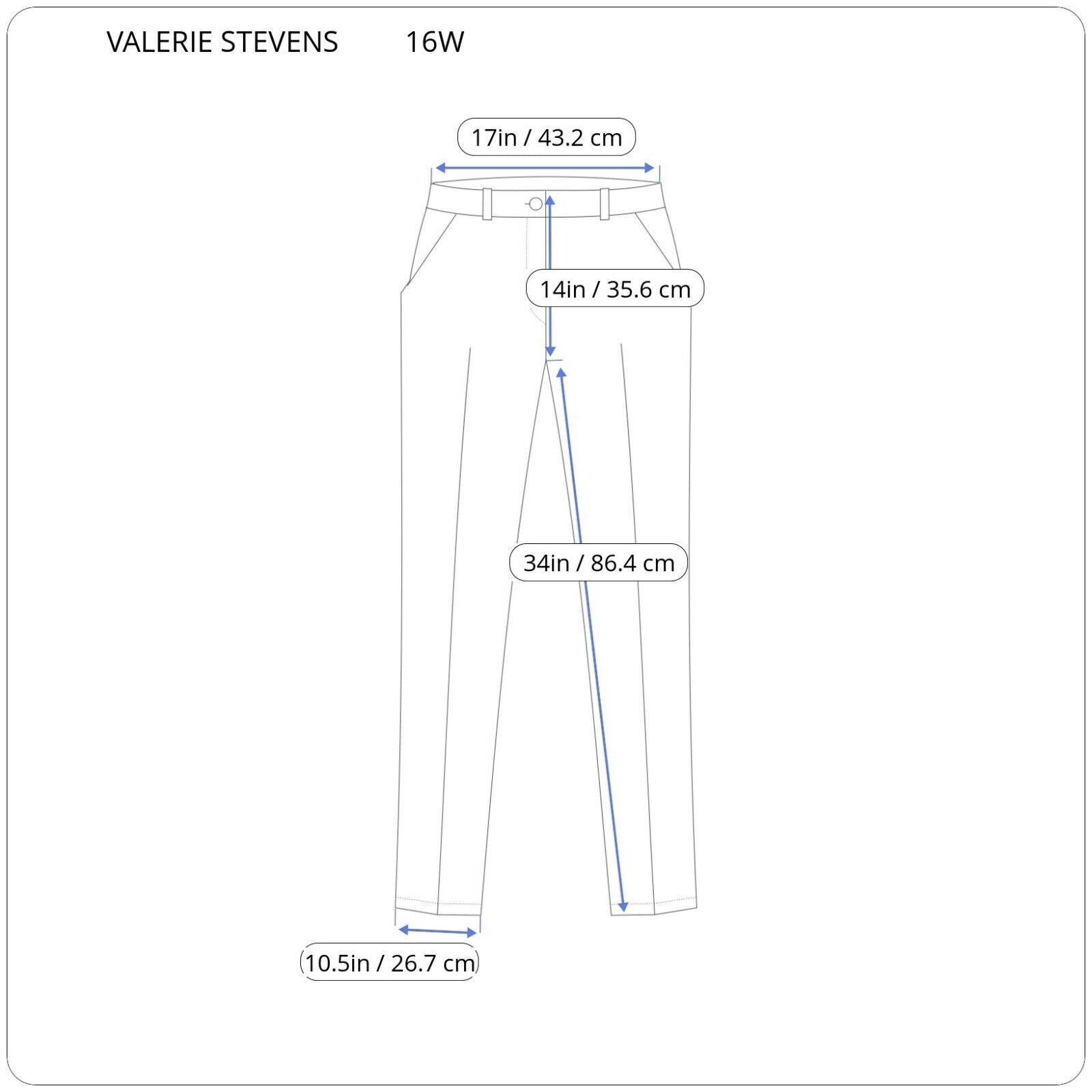 The Valerie Stevens Women's Pants in size 16W are perfect for business occasions. The pants have a blue striped pattern and a zip closure. The high-rise pants have a slimming stripe design and a comfortable elastic waist. The straight leg style pants are made of a polyester blend material and are dry clean only. These dress pants are suitable for all seasons and are a regular fit.