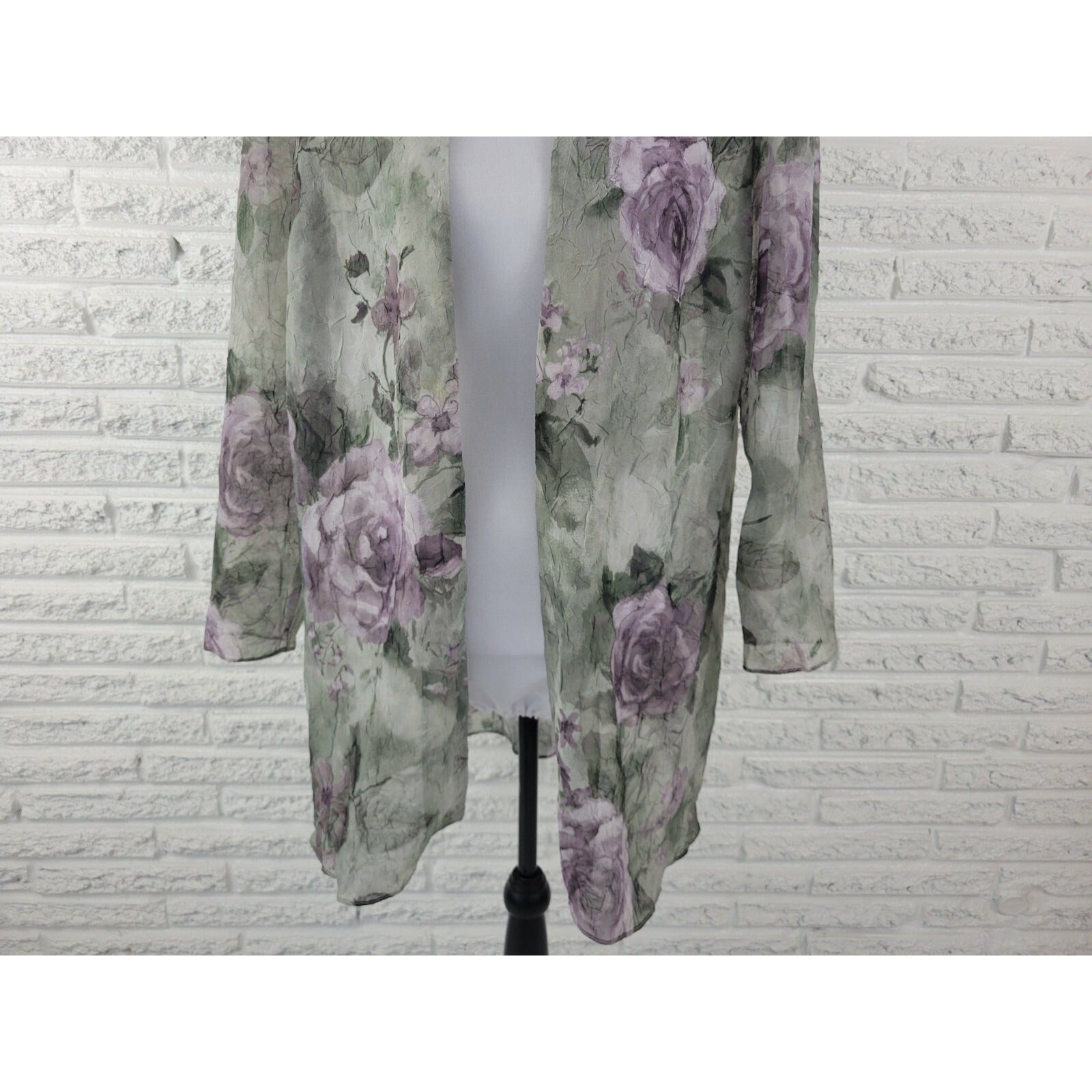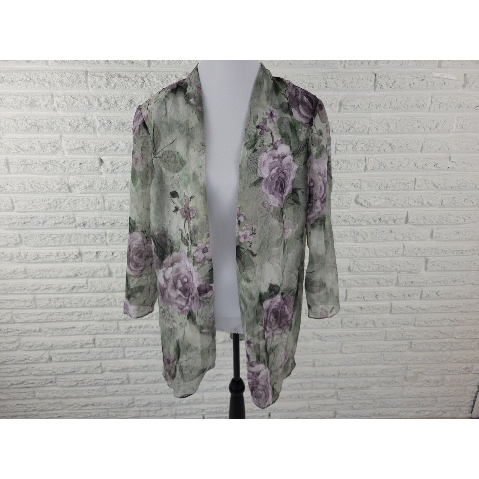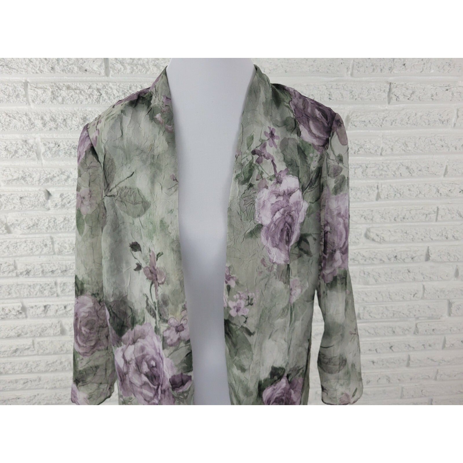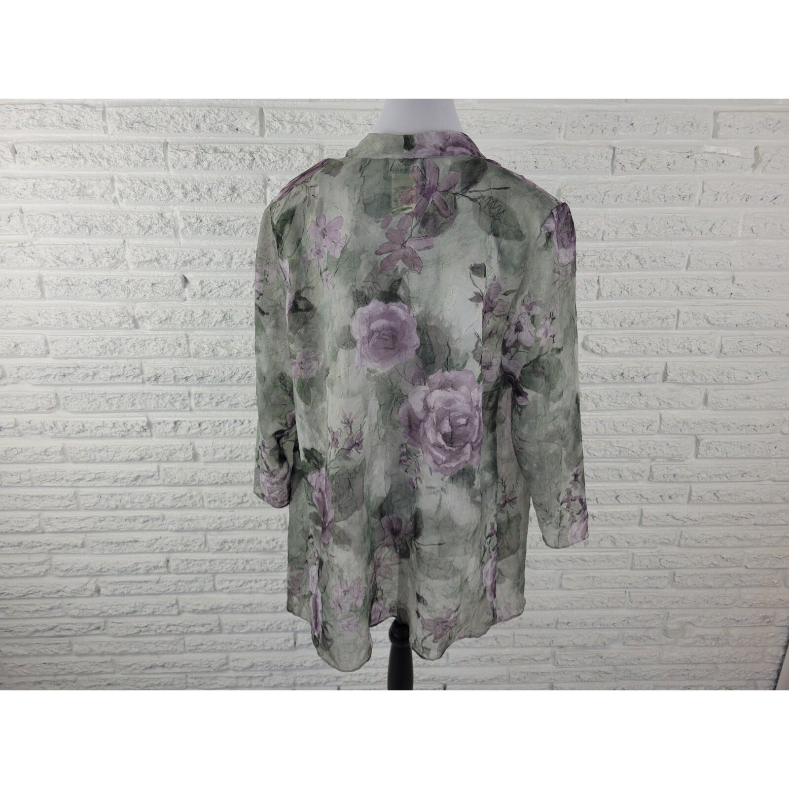 This is a vintage SL Fashions women's top in size 18WP. The blouse features a green/purple floral pattern with long, classic/fitted sleeves and an open overlay design. It is made of polyester material and is machine washable. The blouse is suitable for both casual and business occasions and has a regular fit. It also has sheer features and is suitable for wear in all seasons.