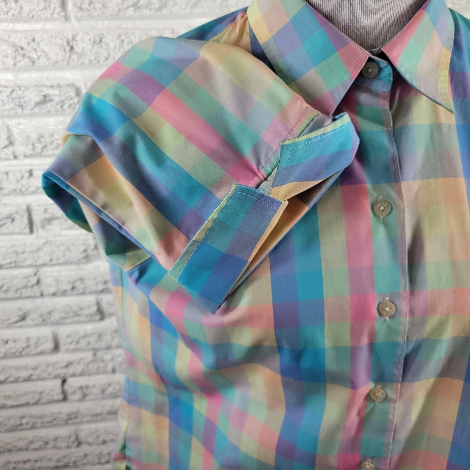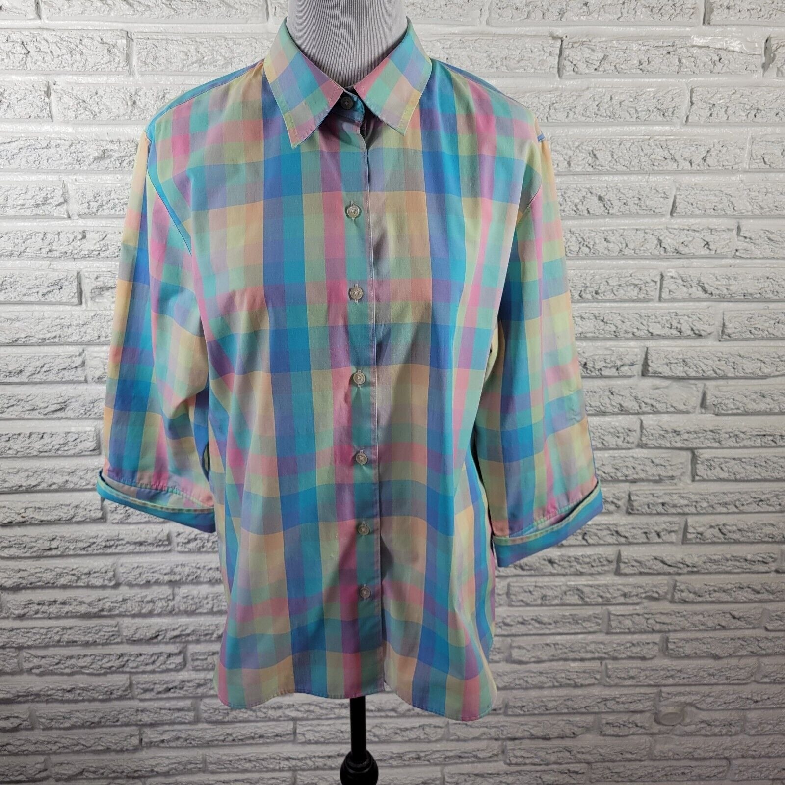 Westbound Womens Top 18 Cuff Sleeve Wrinkle Free Blue Plaid Pastel Lightweight