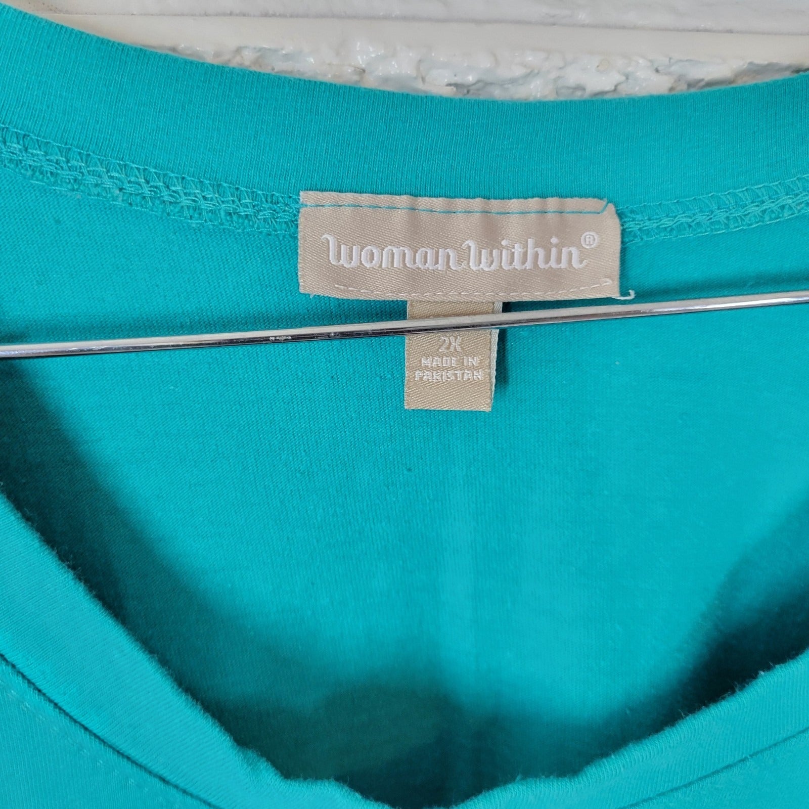 The Woman Within Women's Dress in size 2X with a plus size type is a casual and comfortable knee-length solid green/blue dress designed with short sleeves, a crew neck, and a pullover closure. Made from a cotton blend material, this t-shirt dress features added stretch for a comfortable fit. It also includes convenient pockets and is suitable for various occasions such as travel and everyday wear. The versatile design makes it suitable for all seasons and can be easily machine washed for care. Perfect for a relaxed and stylish look.