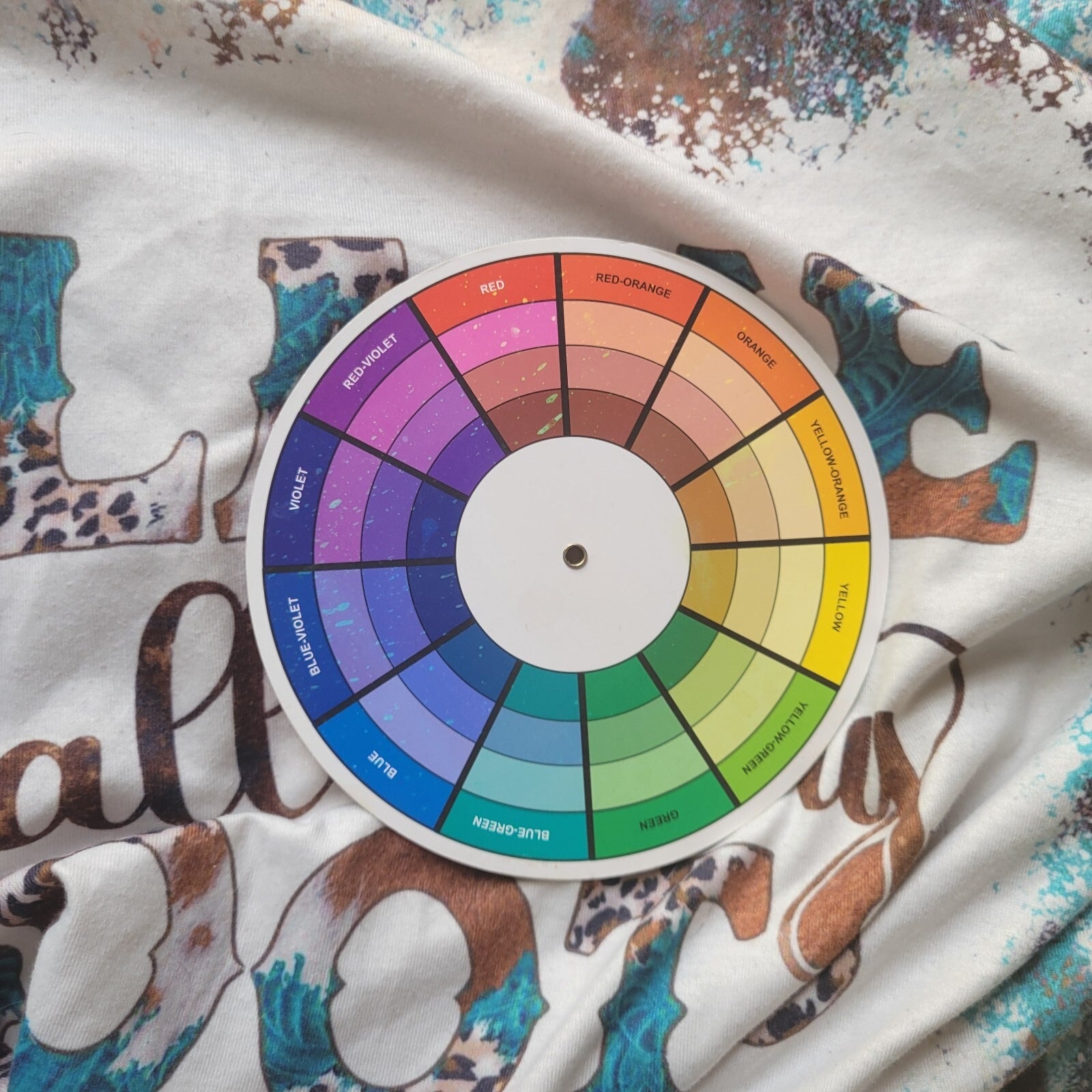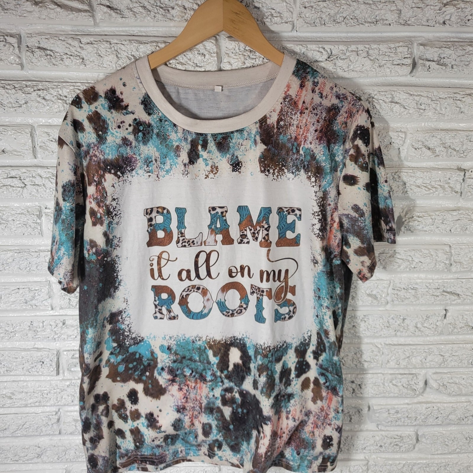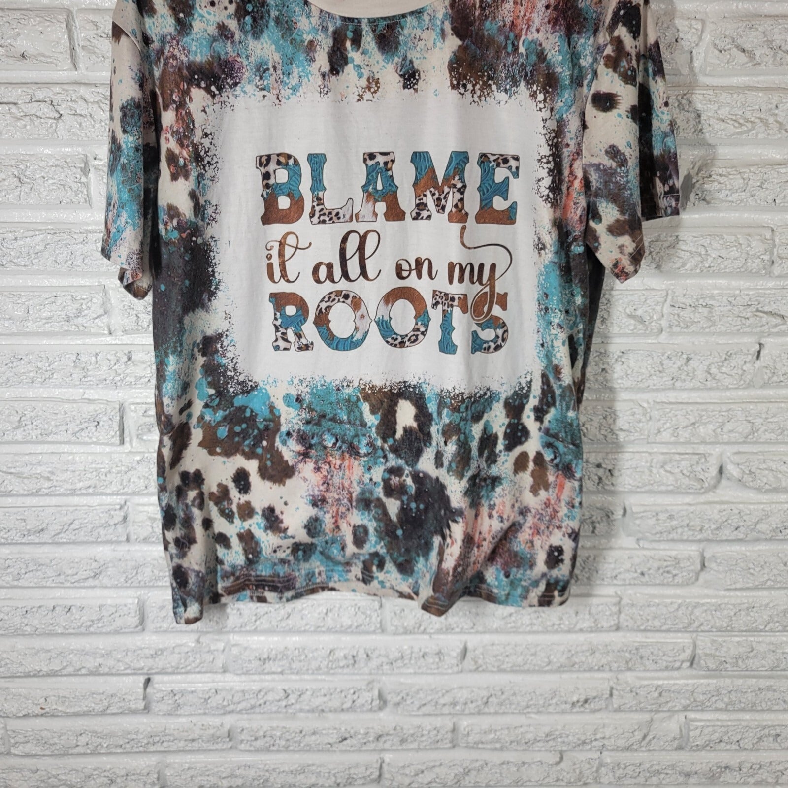 Womens Top XL Tee Cowgirl Blame It All on My Roots Poly Blend Blue Brown Tie Dye