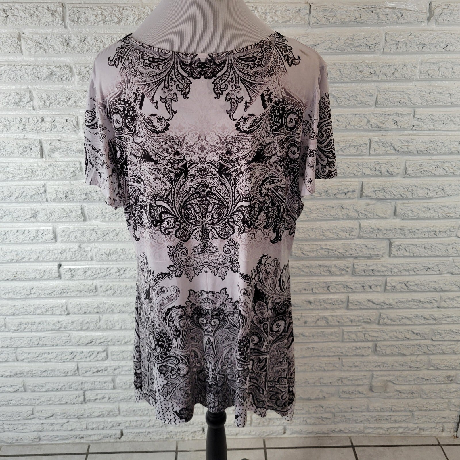 The World Unity Women's Top in size 2X Plus is a stylish and versatile addition to any wardrobe. This black and white paisley blouse features a V-neckline, short casual sleeves, and studded accents for added flair. The polyester blend material offers stretch for comfort, and the pullover closure makes it easy to wear. Perfect for travel or casual occasions, this blouse is machine washable and suitable for all seasons. The regular fit and basic style make it a must-have for any fashion-forward woman.