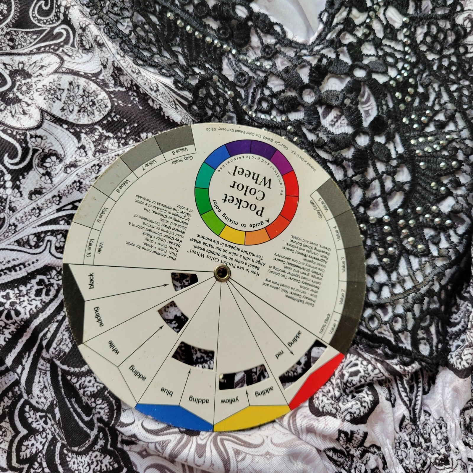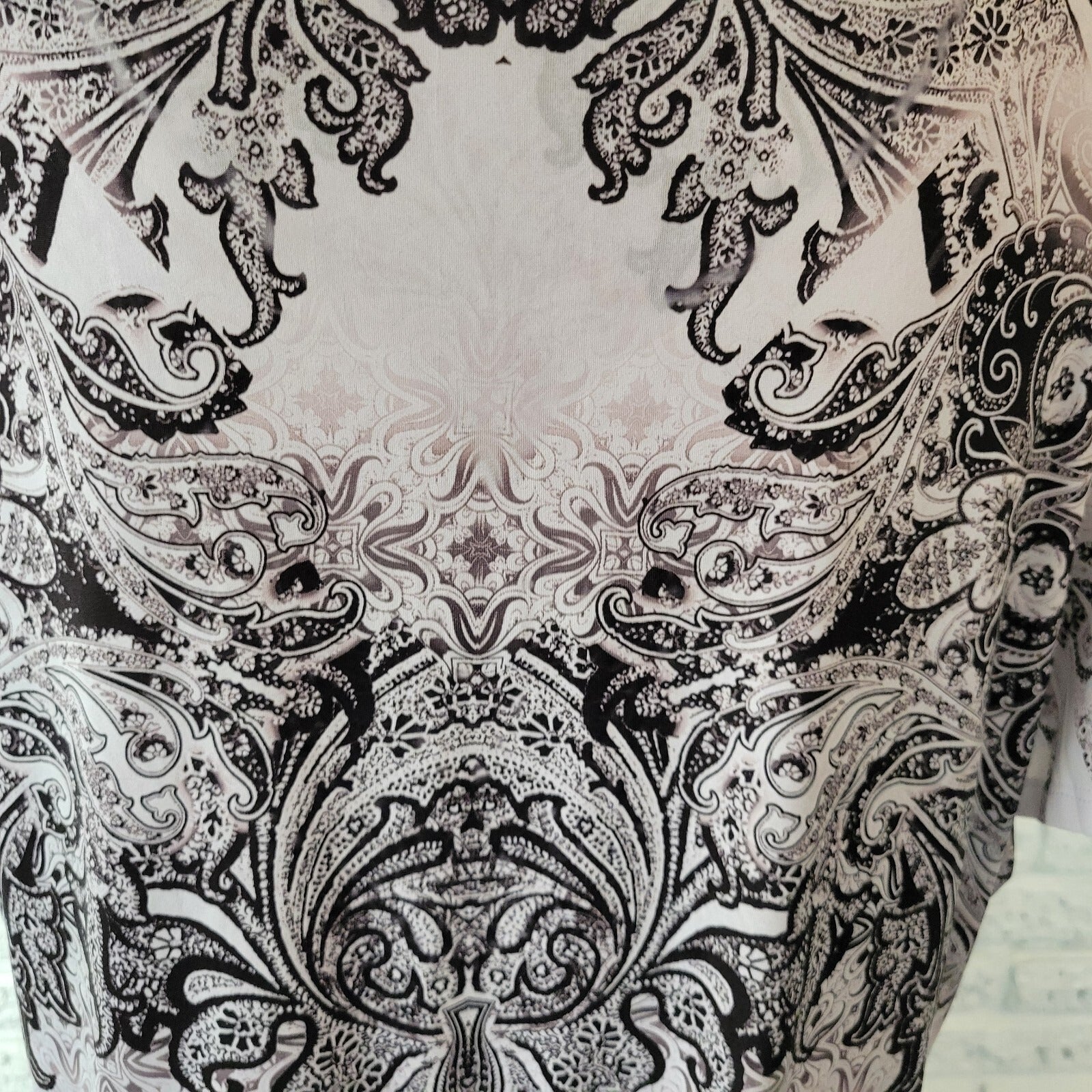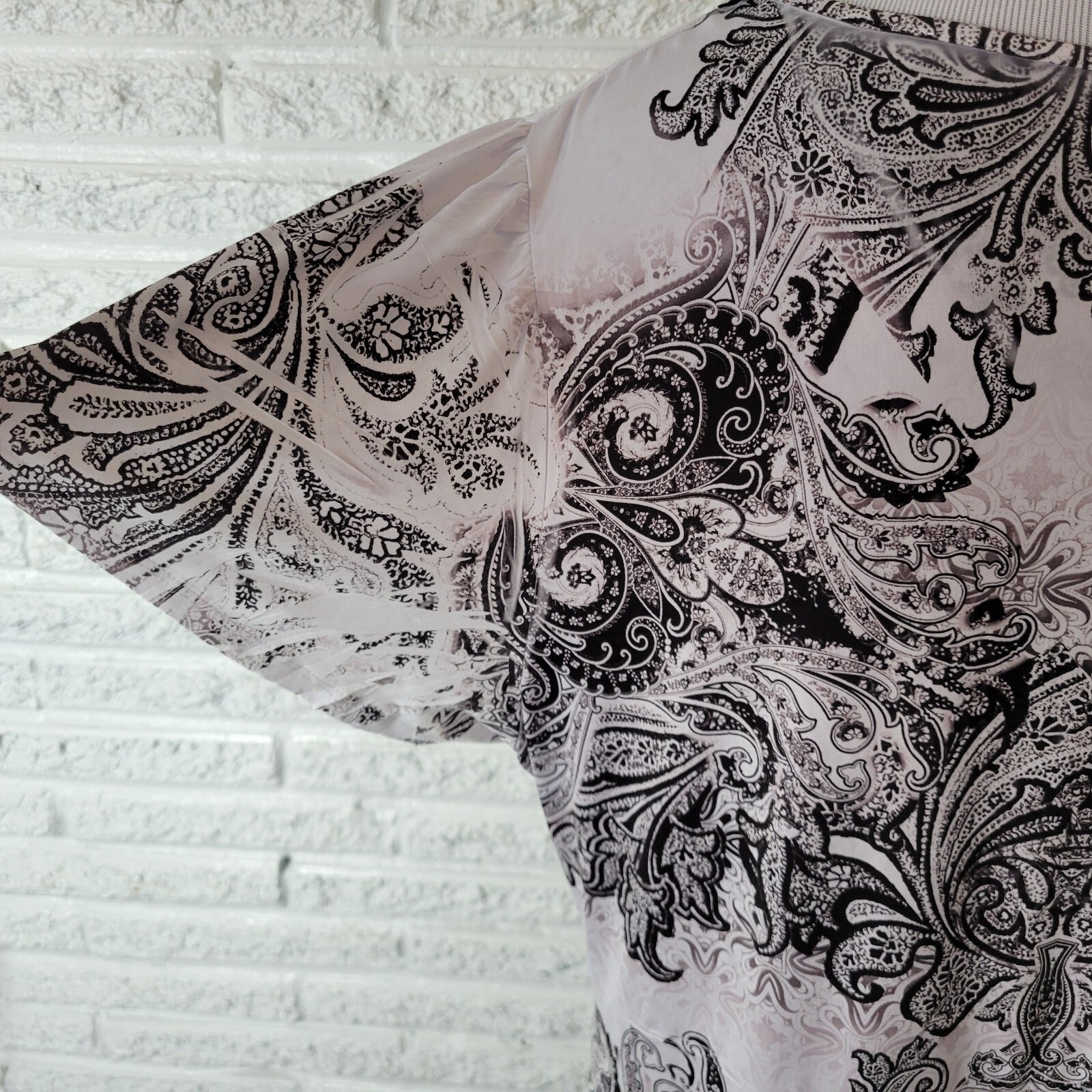 World Unity Womens Top 2X Plus Black White Paisley Asymmetric Lace Trim Studded