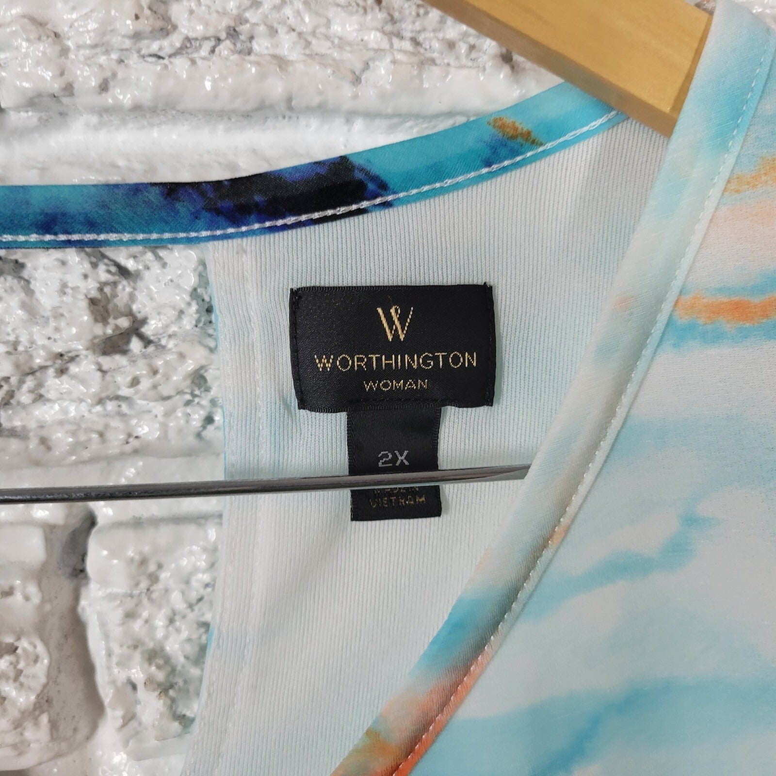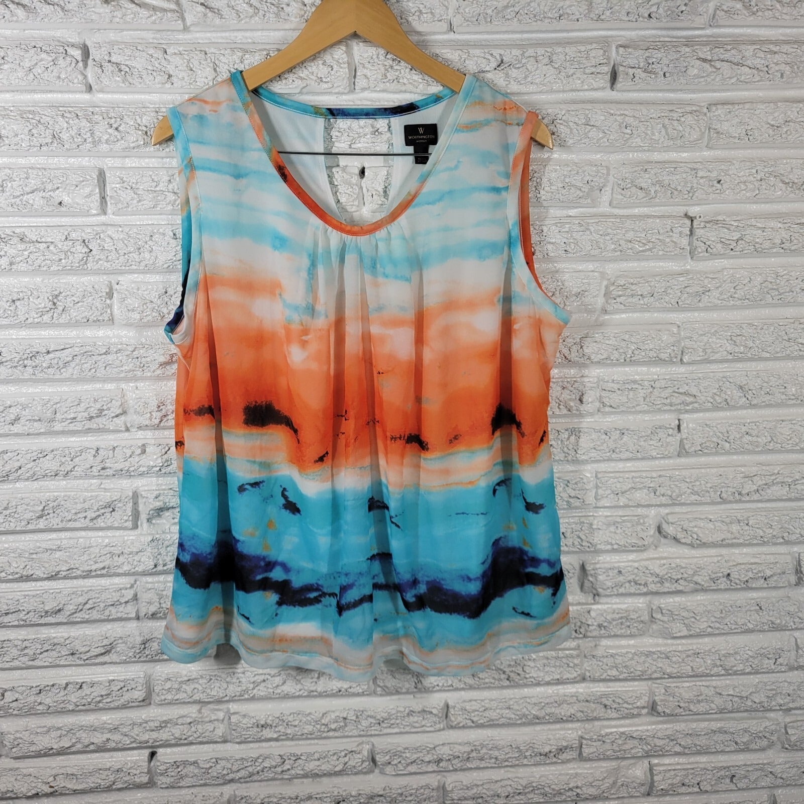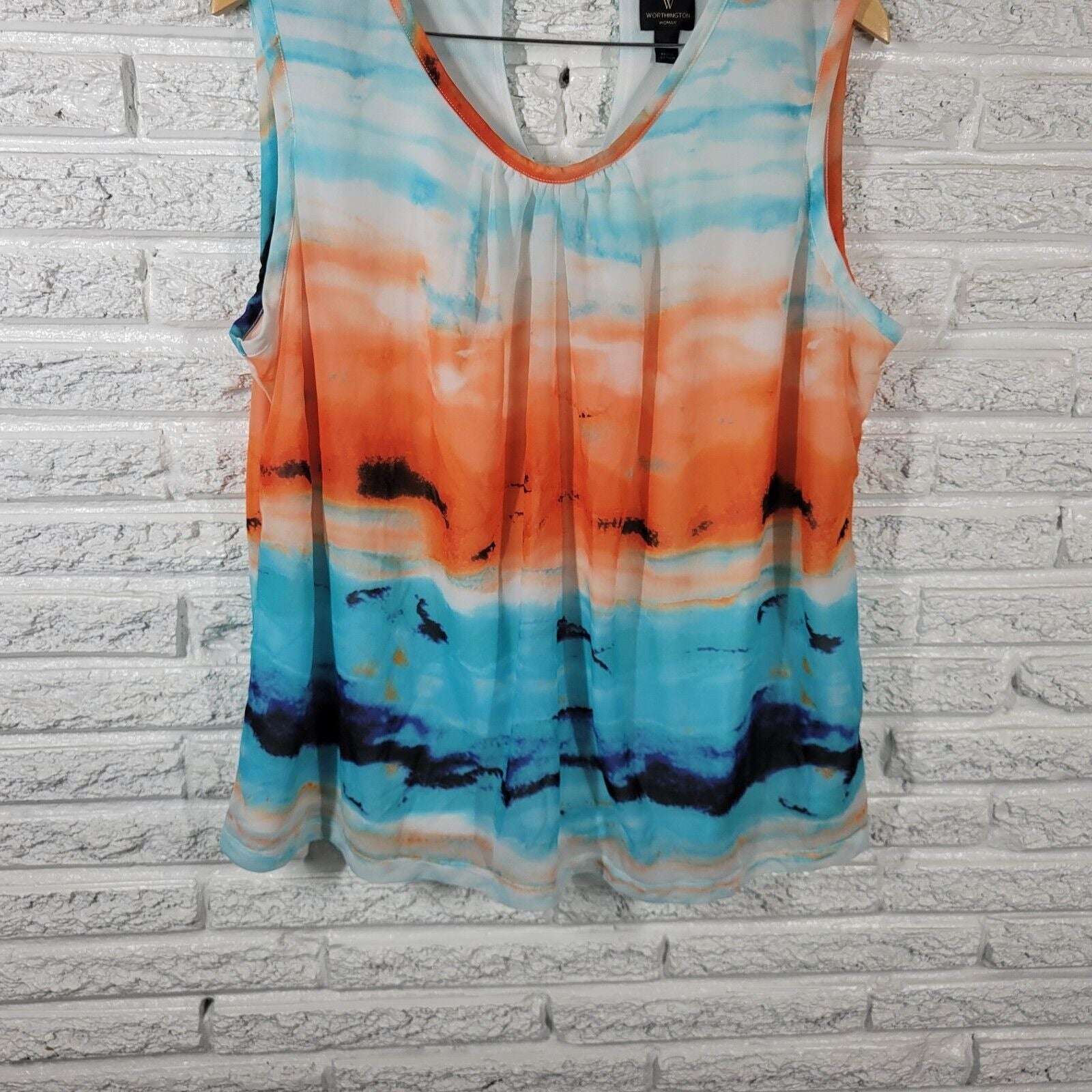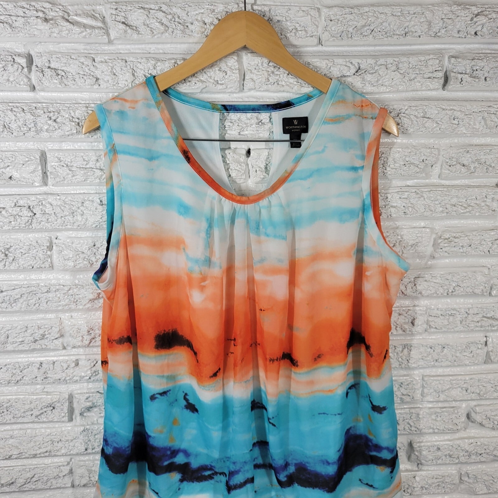 This Worthington women's top is perfect for any casual or travel occasion. The sleeveless tank design features a round neckline and a pullover closure for ease of wear. The orange/blue watercolor chiffon fabric is lightweight and perfect for all seasons. The plus size 2X top is machine washable and features a keyhole neck. The top is perfect for basic wardrobe needs.