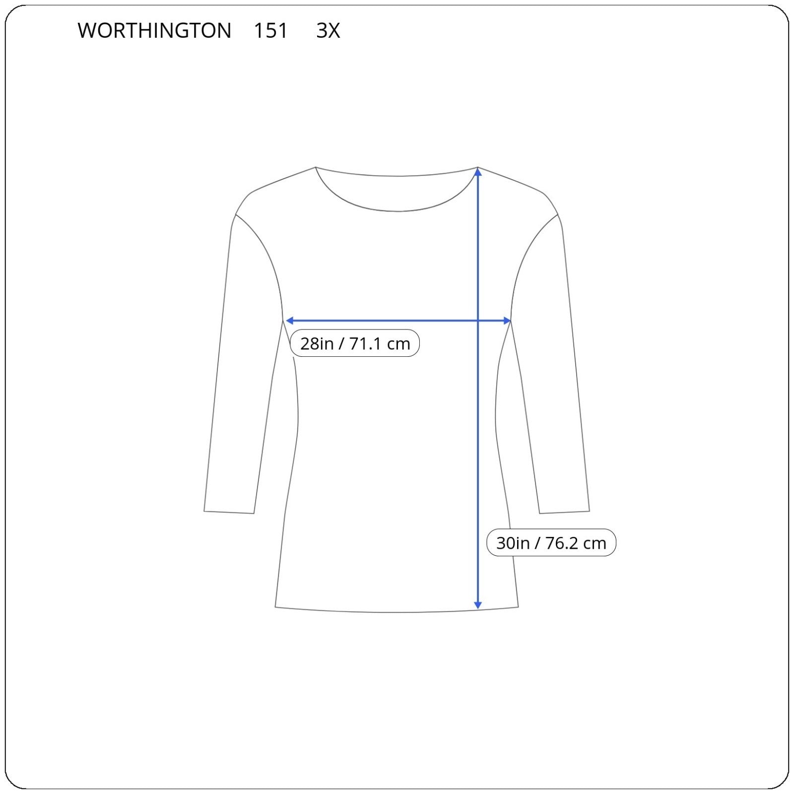 The Worthington Women's Top is a plus-size 3X blouse in a solid blue color, featuring a V-neckline, 3/4 roll tab sleeves, and a lightweight polyester material. This pullover top is designed for travel, casual wear, and business occasions, and is machine washable for easy care. With a regular fit and minimal slit detail, this basic blouse is suitable for all seasons and is made in Vietnam. Perfect for a versatile wardrobe staple that can be styled for various occasions and seasons.