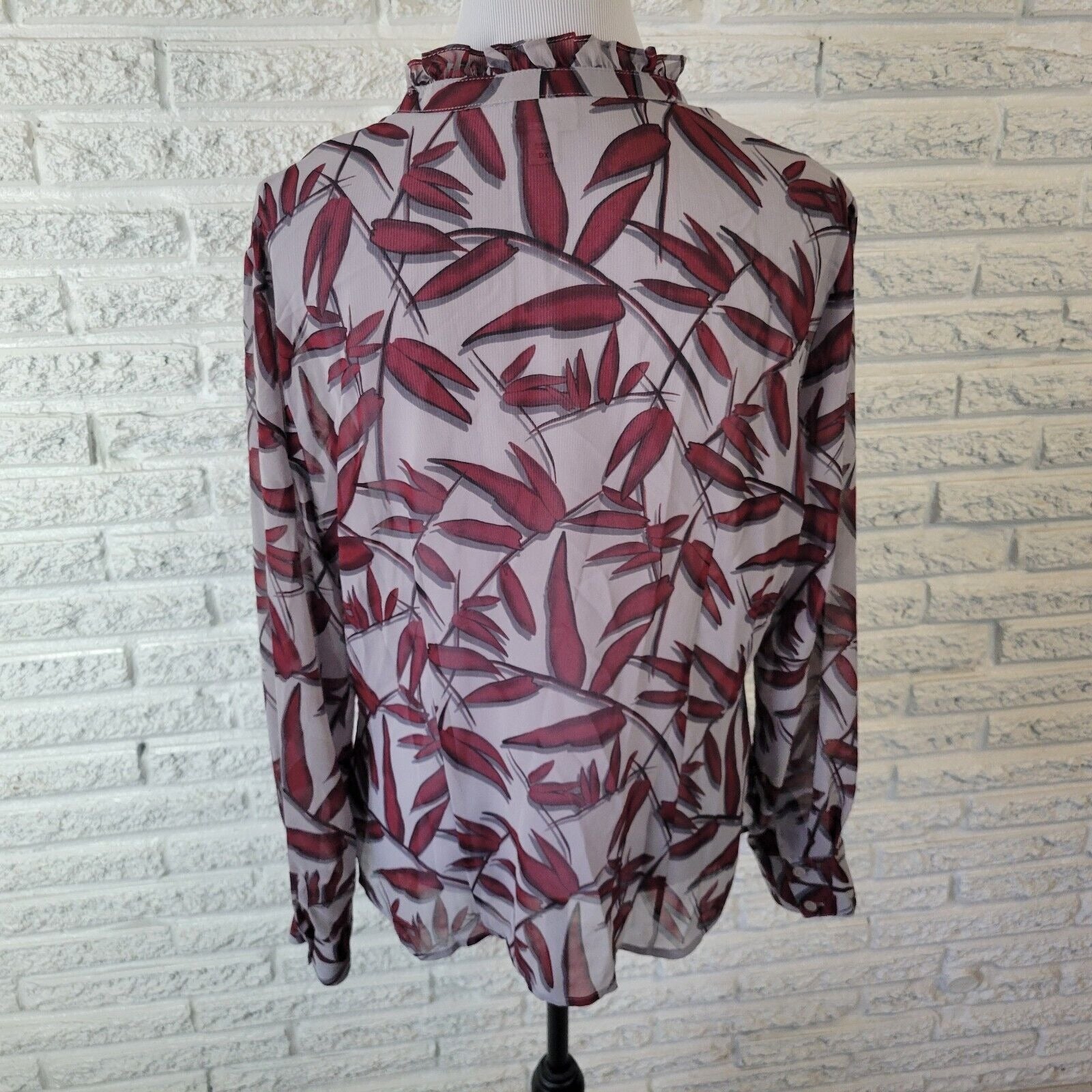Worthington Womens Top Extra Large XL Burgundy Gray Floral Button Ruffle Sheer